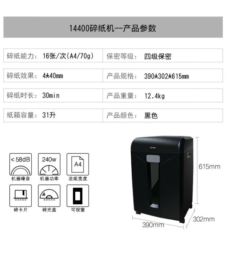 ¥450.24得力(deli)黑金剛辦公碎紙機商用大功率電動保密家用文件粉碎機 5級保密/10張 14401